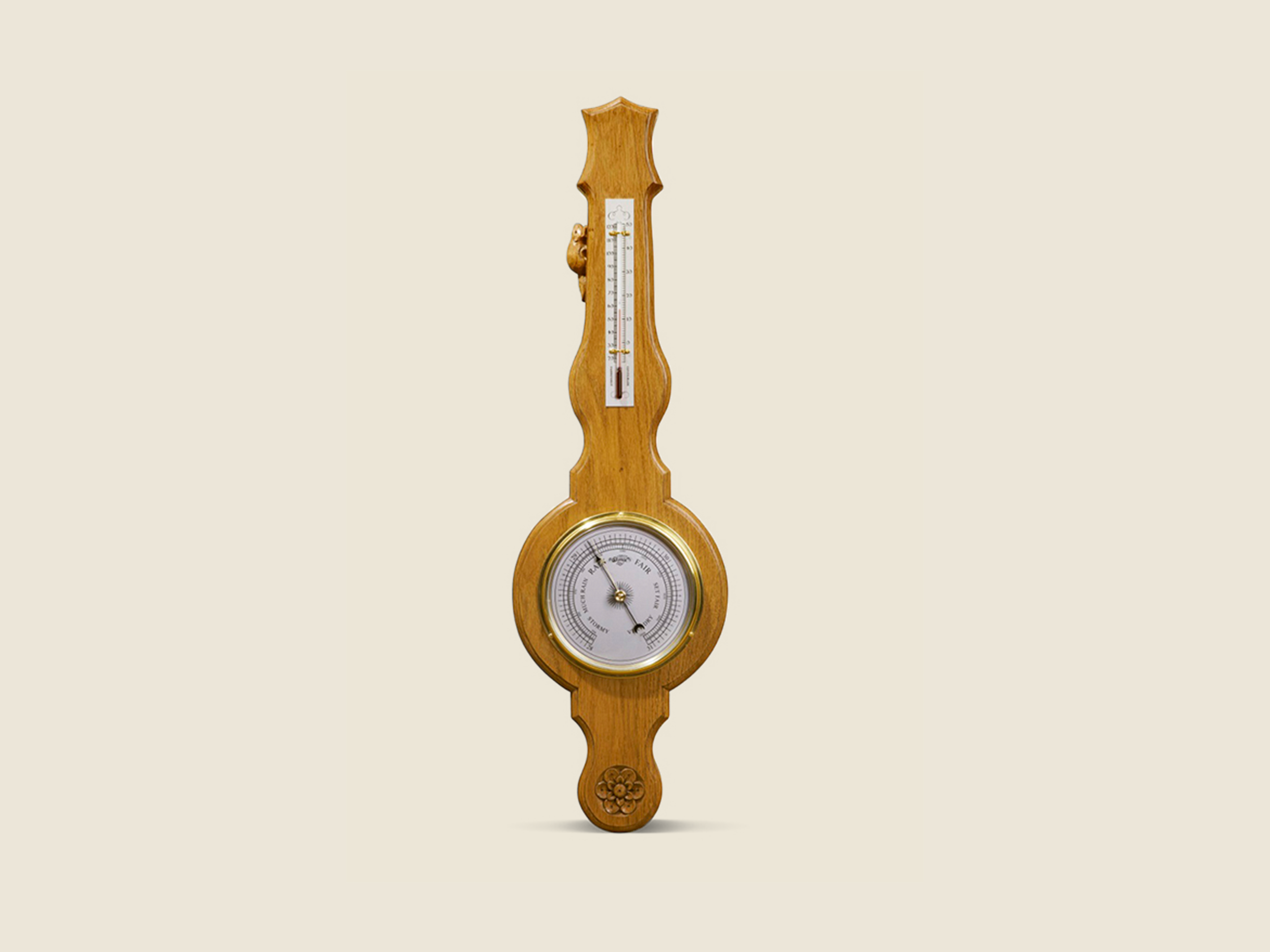 Oak barometer featuring decorative hand carved flower and our "beaver" trademark. The barometer is shown in medium "fume" English oak and has a waxed finish. Supplied with a brass plate for hanging on the wall